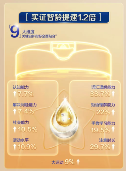 最令人印象深刻的是智龄提速1.2倍的实证数据。这意味着启萃不仅提供营养,更助力宝宝实现“神经生长+神经链接+神经优化”的三维有效提升。